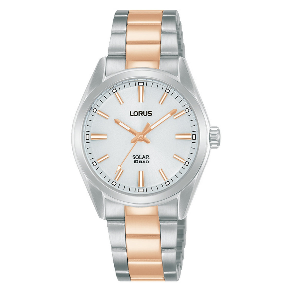 LORUS SOLAR LADIES TWO TONE ROSE STAINLESS STEEL WHITE DIAL BRACELET WATCH